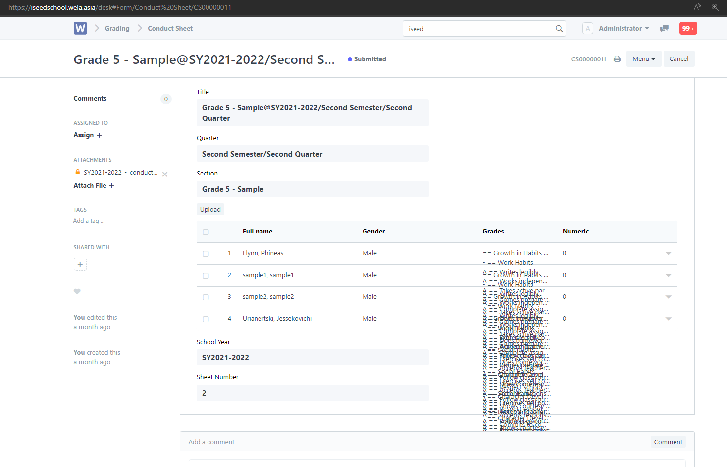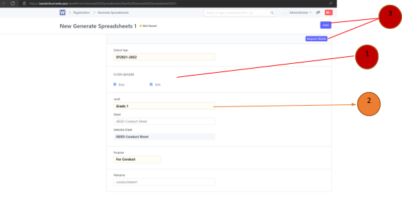 Check both boys and girls> Select Grade level 1-10 > Select the sheet > “iSEED Conduct Sheet” > purpose: For Conduct. After that on the top right click save then request sheets.