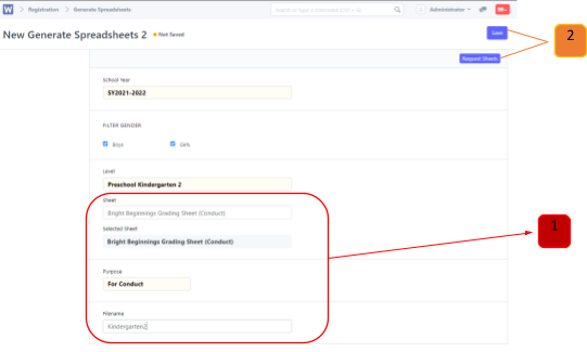 Select the sheet for Bright Beginnings: “Bright Beginnings Grading Sheet (Conduct)”. The Purpose will automatically be For Conduct. Then input a file name. After that click save and request sheets in the top right.