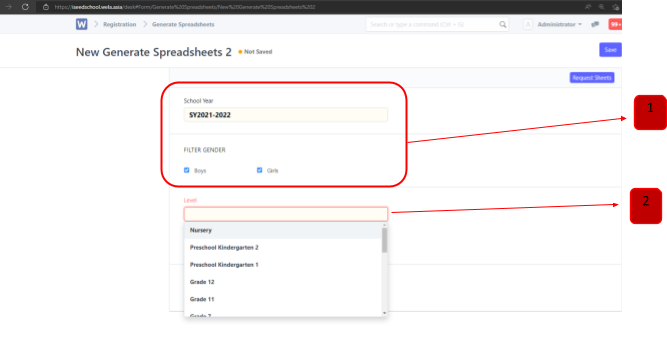 Make sure the School Year is correct, Check both Boys and Girls. Then Select the level, for Bright Beginnings: Nursery – Kindergarten 2