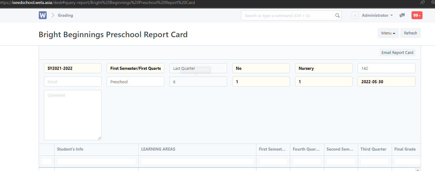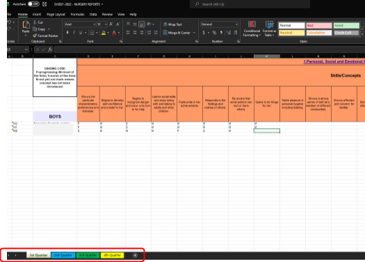 Open the excel file and input grading. There are 4 sheets which indicates the semester/quarters in the bottom left. For Nursery/preschool we grade using the letters P (Progressing), M (most of the time), S (some of the time) & N (not yet) same with the report card.
